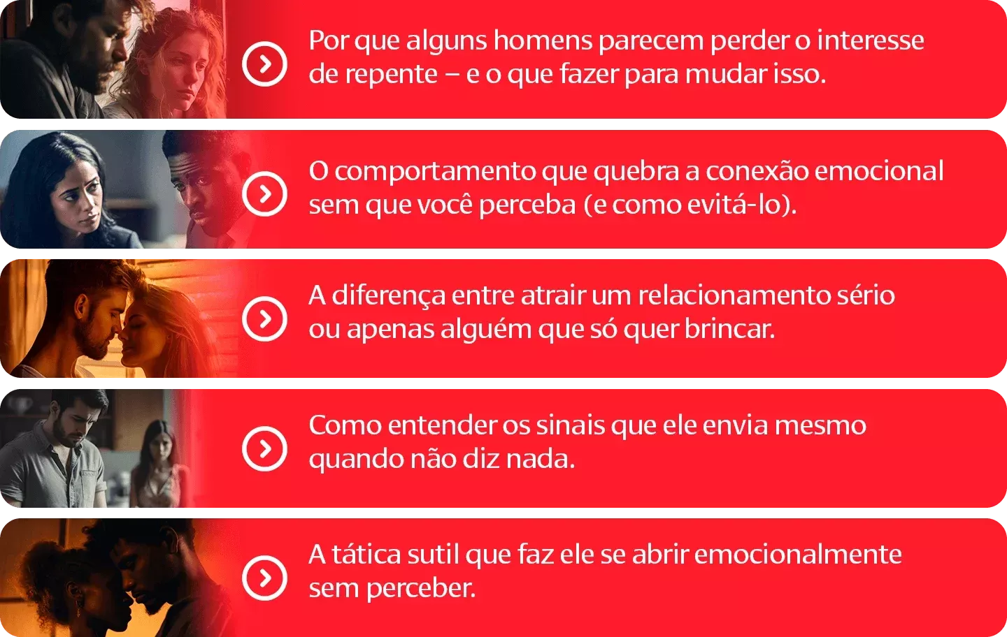 Sou especialista em relacionamentos há 7 anos e dono do maior canal no YouTube sobre o assunto no Brasil. Minha missão é ajudar mulheres a conquistarem uma vida de alto valor e, consequentemente, um relacionamento dos sonhos. Não estou aqui para ensinar joguinhos ou truques, mas para mostrar como você pode se tornar uma mulher inesquecível, leve e apaixonante para um homem de valor.